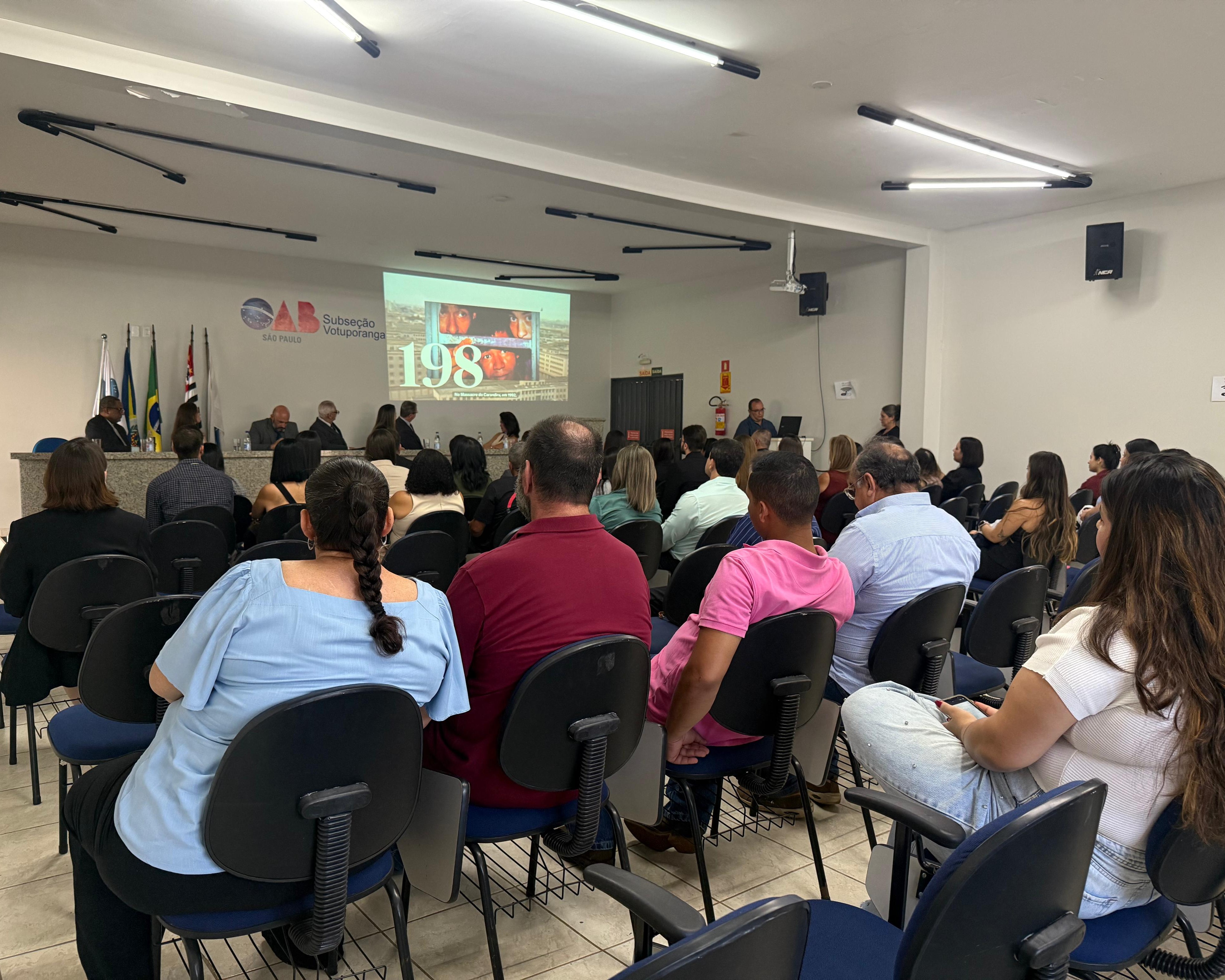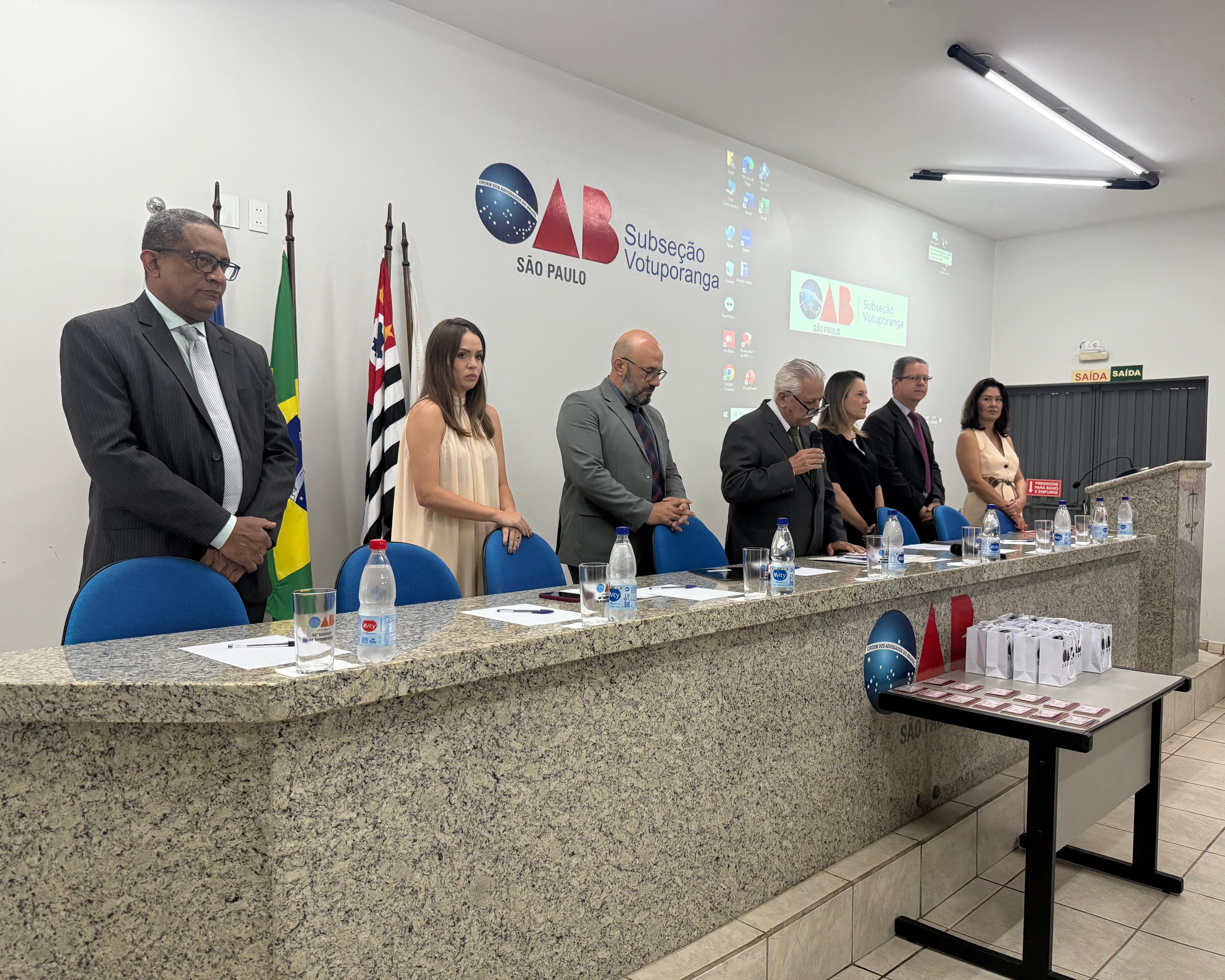 A mesa principal foi composta pelo presidente da OAB de Votuporanga, Adelino Ferrari Filho; o presidente da 25ª Turma do Tribunal de Ética e Disciplina (TED), Joel Mariano Silvério; a coordenadora do curso de Direito da Unifev, Profa. Ma. Éllen Cassia Giacomini Casali; e os membros da diretoria da subseção, Bruno de Moraes Dumbra, vice-presidente; Josué Carvalho Santos, secretário adjunto; Elaine Akita Fernandes, tesoureira; e Laira Trindade, da Comissão da Jovem Advocacia.
