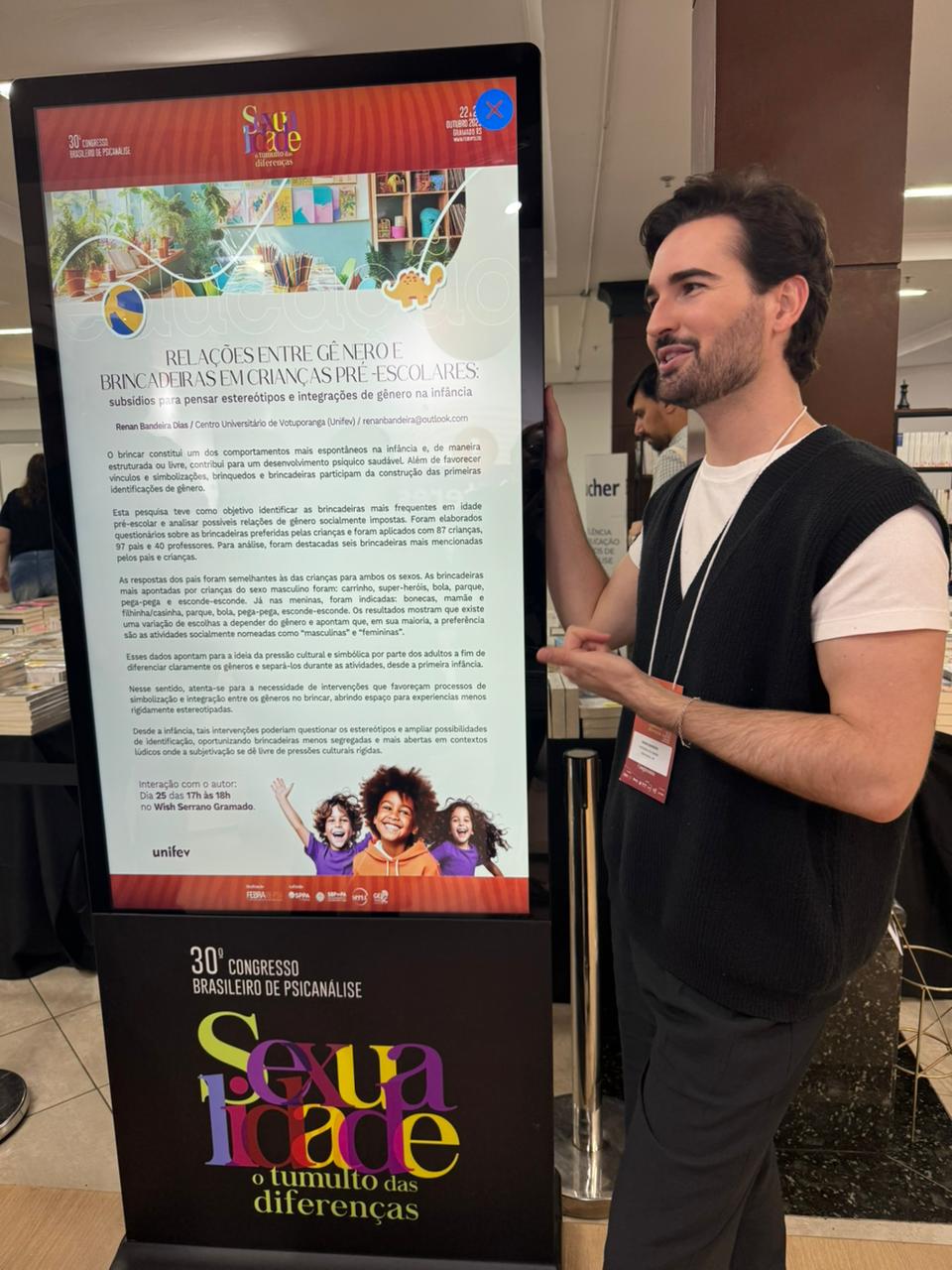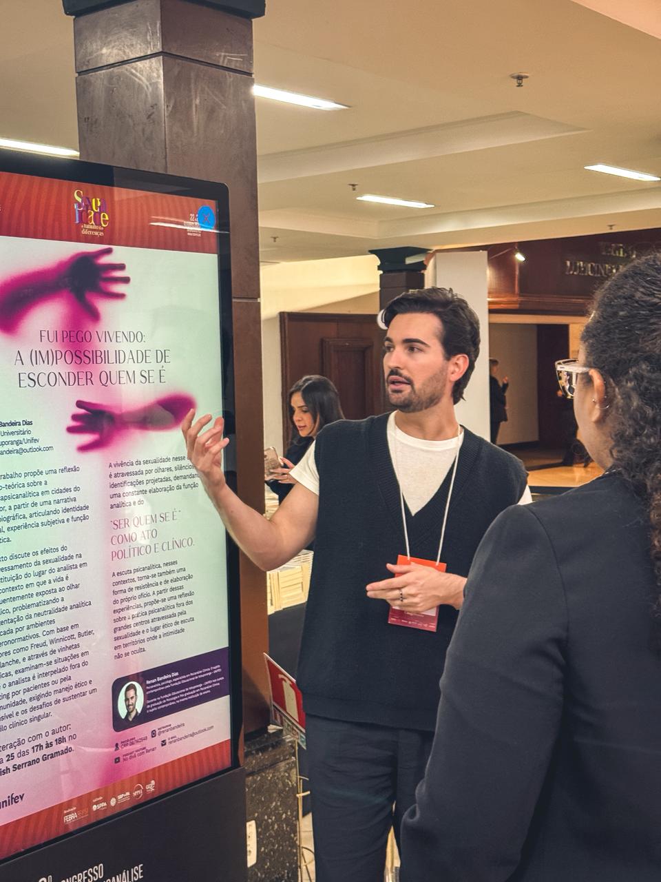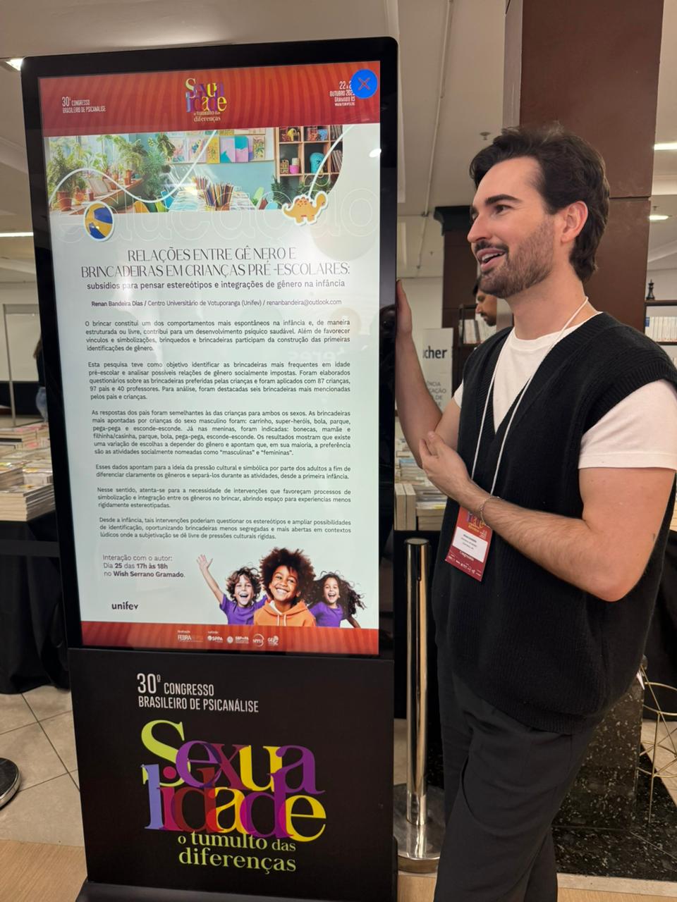 O docente e egresso do curso de Psicologia da Unifev, Prof. Esp. Renan Bandeira Dias, participou do 30º Congresso Brasileiro de Psicanálise da Federação Brasileira de Psicanálise (Febrapsi), realizado recentemente em Gramado (RS). O evento é considerado um dos mais importantes do país na área e reuniu mais de 1.700 participantes, entre profissionais, pesquisadores e estudantes.