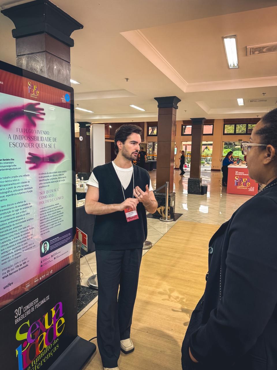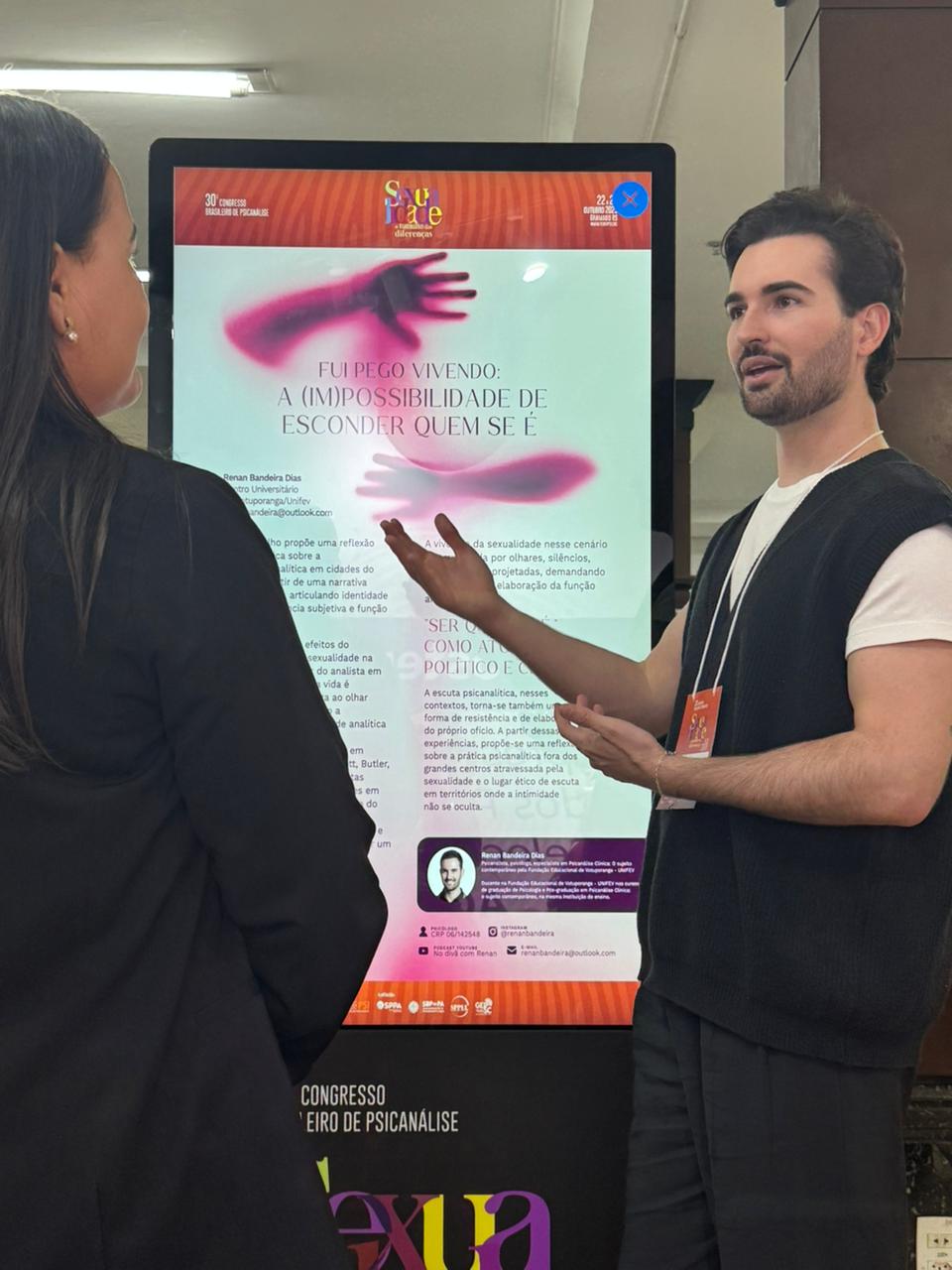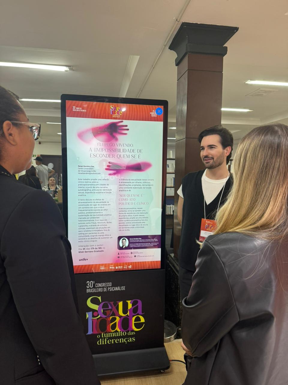 O docente e egresso do curso de Psicologia da Unifev, Prof. Esp. Renan Bandeira Dias, participou do 30º Congresso Brasileiro de Psicanálise da Federação Brasileira de Psicanálise (Febrapsi), realizado recentemente em Gramado (RS). O evento é considerado um dos mais importantes do país na área e reuniu mais de 1.700 participantes, entre profissionais, pesquisadores e estudantes.