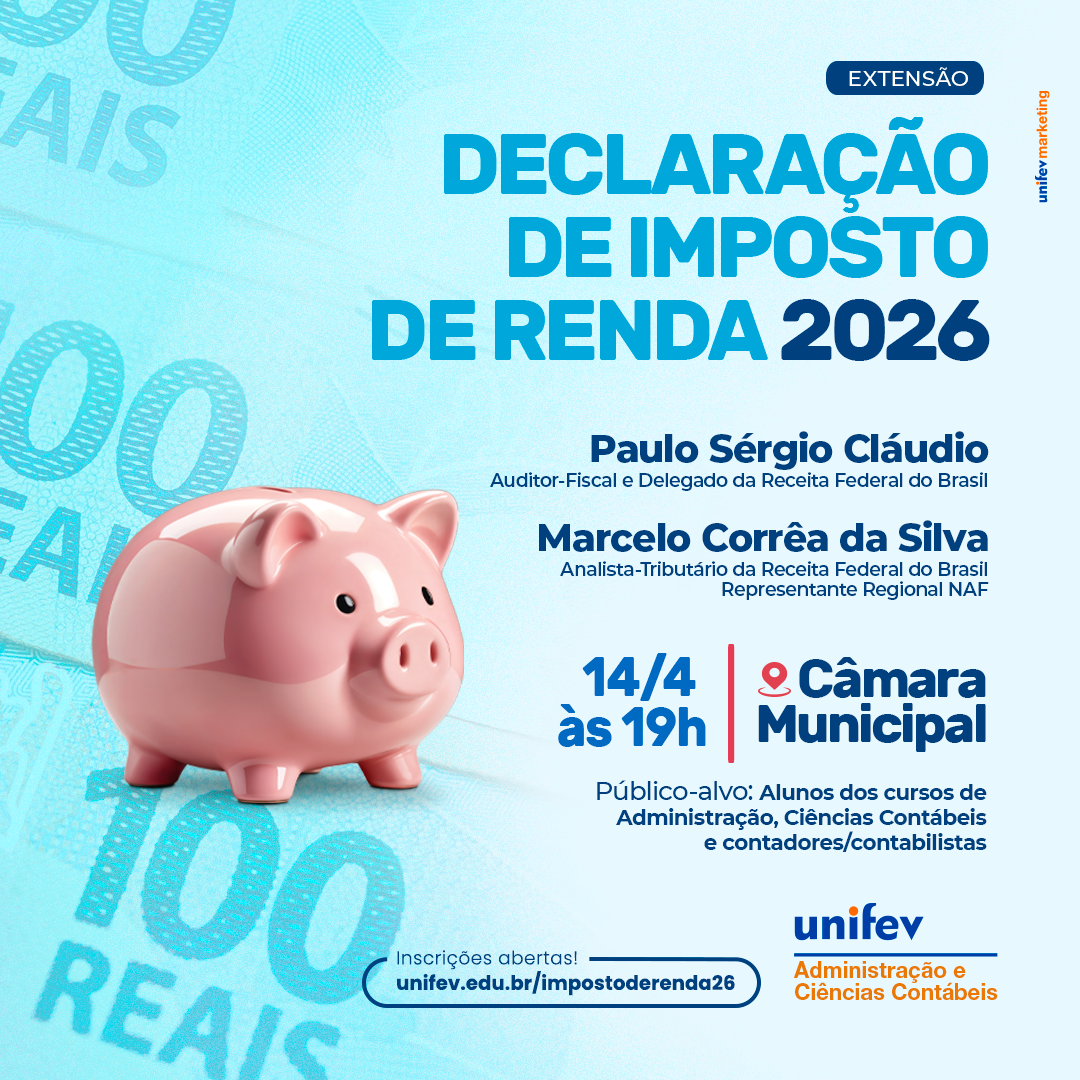 A Unifev realizará, no dia 14 de abril, a partir das 19h, na Câmara Municipal de Votuporanga, a palestra “Declaração do Imposto de Renda 2026”. O evento será ministrado pelo auditor-fiscal Paulo Sérgio Cláudio, Delegado da Receita Federal do Brasil, e pelo analista-tributário da Receita Federal, Marcelo Corrêa da Silva, que também atua como representante regional do órgão federal junto ao Núcleo de Apoio Fiscal e Contábil (NAF) da Instituição.