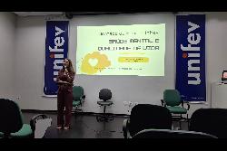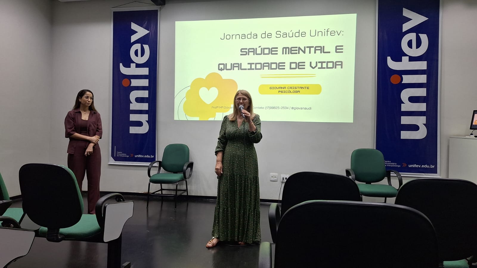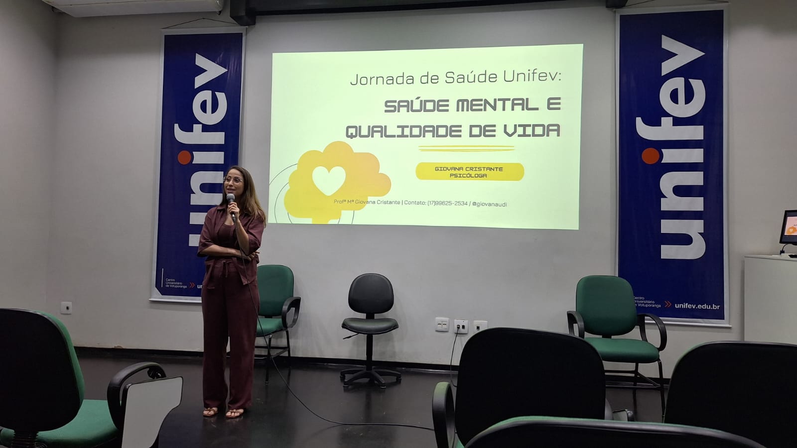 A Unifev, por meio do setor de Recursos Humanos/Gestão de Pessoas, promoveu nesta sexta-feira (26/09) aos colaboradores uma palestra sobre saúde mental e qualidade de vida. As orientações foram feitas pela psicóloga e docente do curso de Psicologia da Instituição, Profa. Ma. Giovana Regina da Silva Cristante, que abordou as práticas para o fortalecimento do bem-estar e as maneiras de se evitar o desenvolvimento de doenças por questões emocionais e psicológicas.