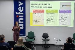 A Profa. Ma. Marinês Ralho, do setor de Recursos Humanos/Gestão de Pessoas, explicou que a palestra tem o intuito de promover mais informações aos colaboradores. "Convidamos a Profa Giovana, docente na área de Psicologia Organizacional do Trabalho, para compartilhar reflexões que contribuam para a construção de um ambiente de trabalho mais saudável, empático e acolhedor. Essa iniciativa busca promover a conscientização, reduzir o estigma em torno do tema e incentivar práticas de autocuidado e apoio mútuo”, justificou Marinês.