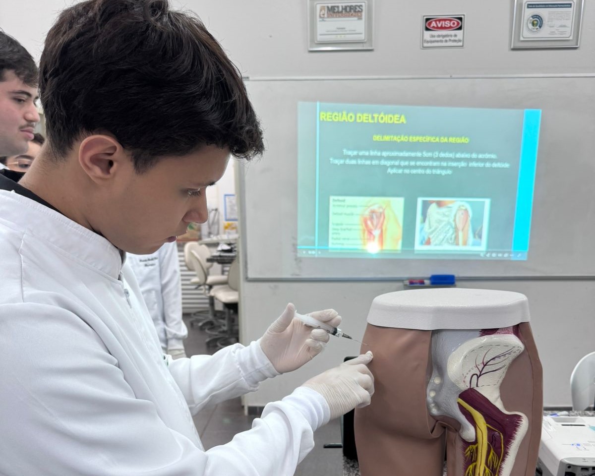 O Prof. Me. Bruno Benhocci Santana, supervisor da capacitação, destacou a importância da abordagem prática das aulas. “Nosso objetivo é garantir que os discentes, futuros profissionais, realizem este procedimento de maneira correta, humanizada e eficaz, prezando sempre pela saúde do paciente. O curso é uma atualização essencial nas técnicas de aplicação de injetáveis, incluindo as vias intramuscular, subcutânea, intradérmica e intravenosa”, explicou o docente.