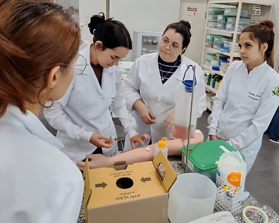 Sob a condução da Profa. Ma. Maria Laís Devólio de Almeida, os participantes aprimoraram suas técnicas de coleta com uma abordagem teórica e prática. “Os temas incluíram coleta de sangue venoso, sequência de tubos para coleta a vácuo, principais veias para acesso venoso, homogeneização das amostras, entre outros”, destacou.