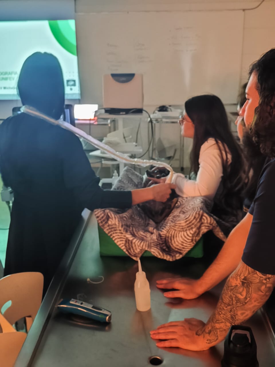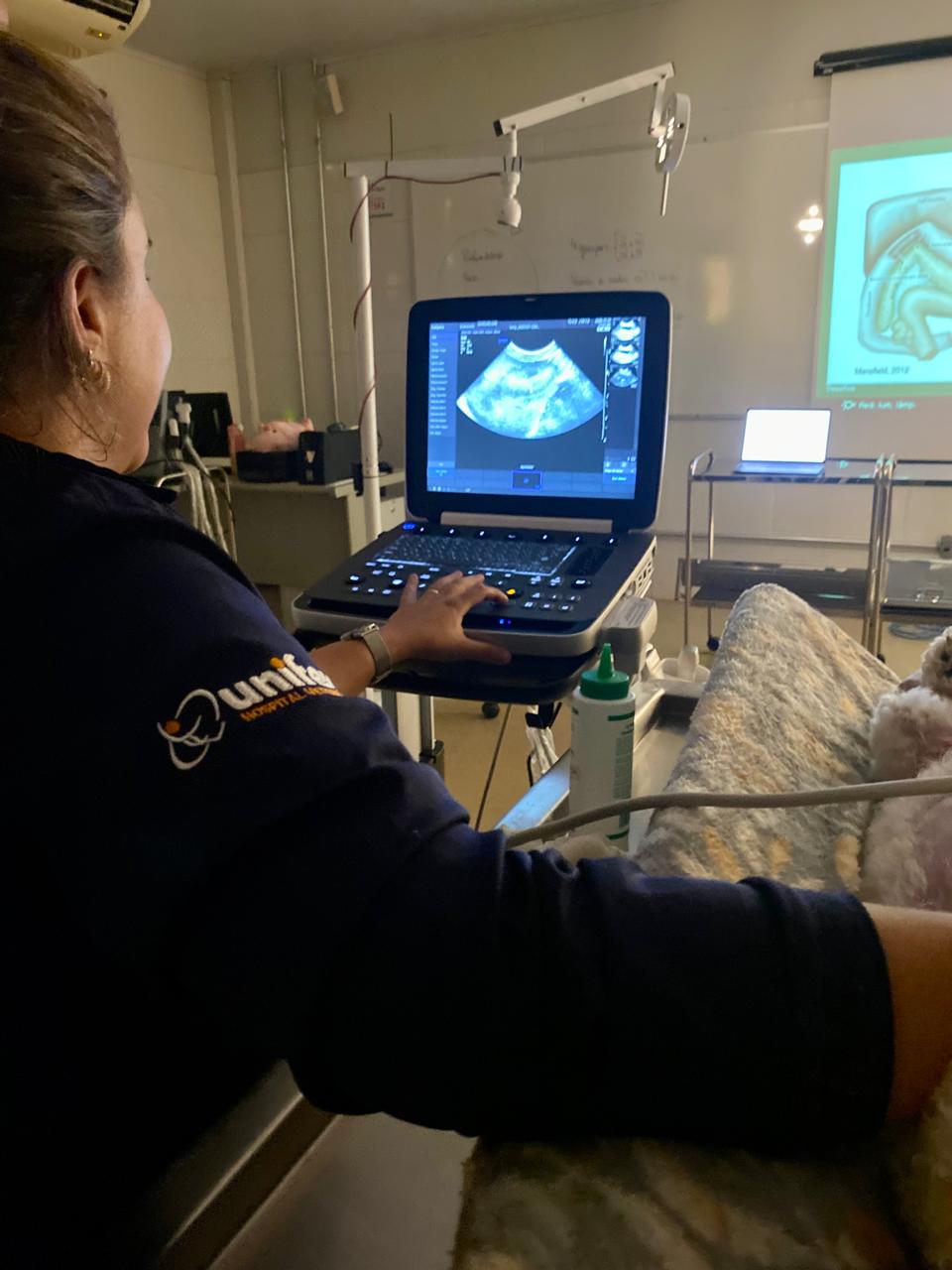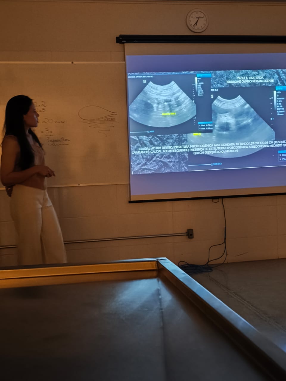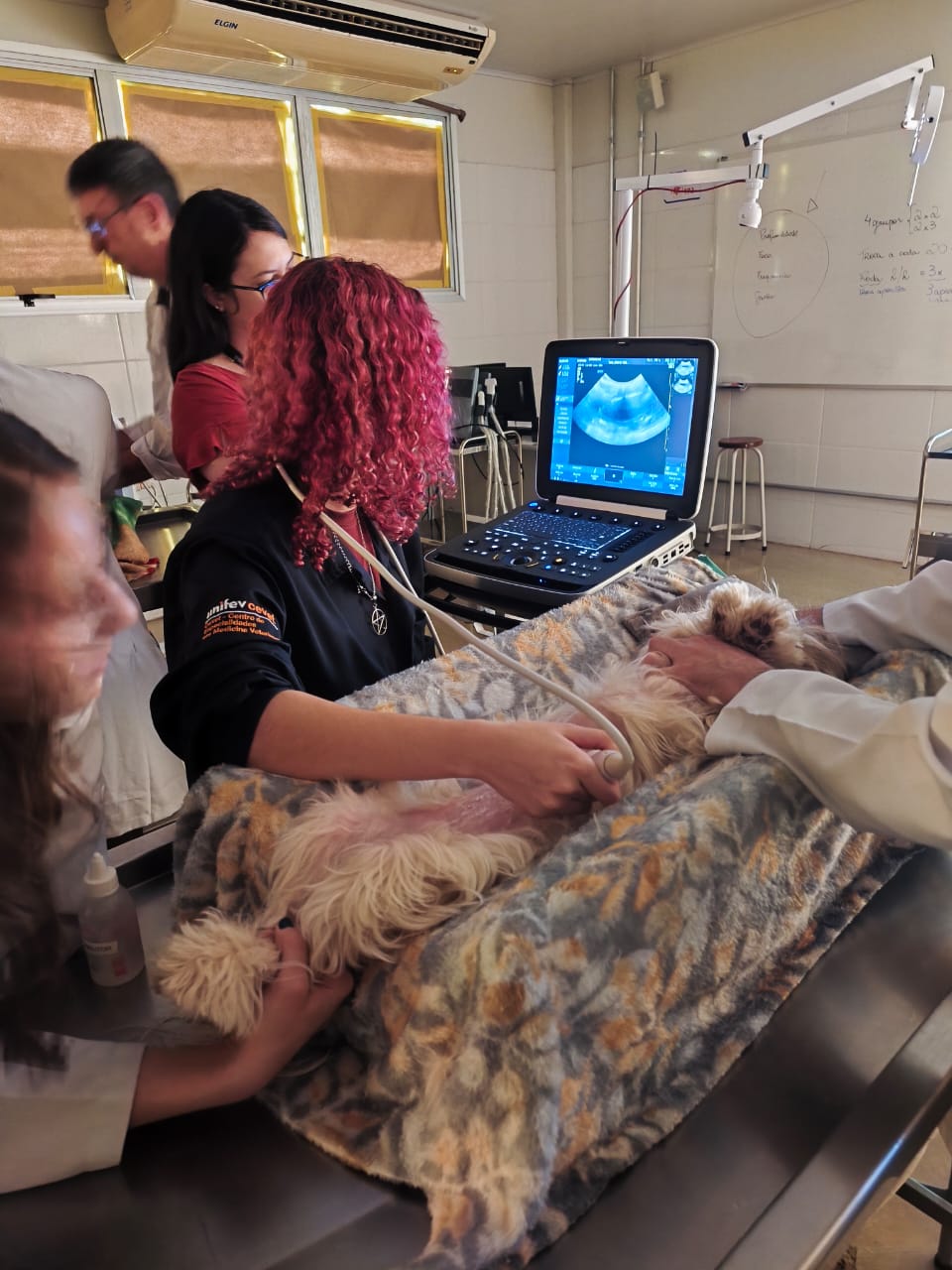Com 39 horas de atividades, o curso foi dividido igualmente entre aulas teóricas e práticas supervisionadas, proporcionando aos participantes uma formação sólida e aplicada. Os conteúdos abordaram princípio físico, técnica ultrassonográfica, anatomia e avaliação dos sistemas urinário, hepático, gastrointestinal, baço e aparelhos reprodutores, além da elaboração de laudos.