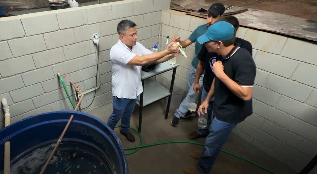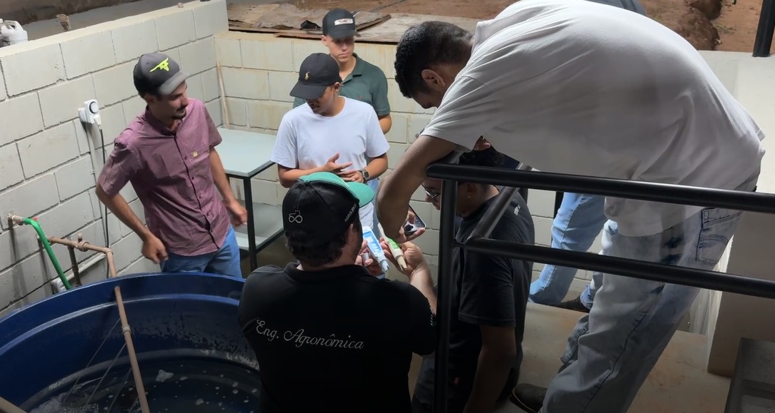 Durante as atividades, os estudantes realizam o monitoramento do sistema hidropônico, acompanhando fatores como pH e condutividade elétrica da solução nutritiva, garantindo condições adequadas para o cultivo.