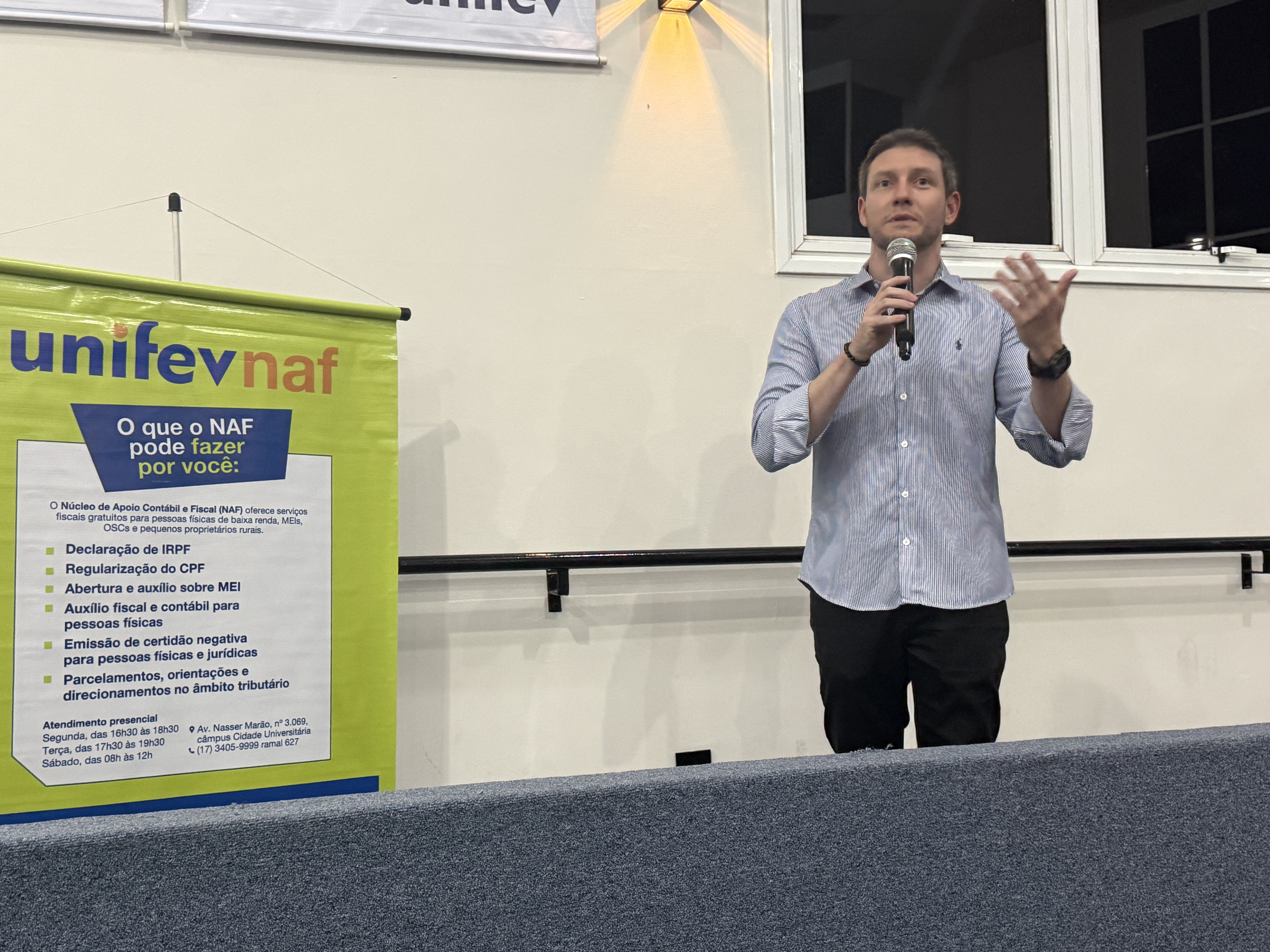 A palestra foi ministrada pelo delegado da Receita Federal em São José do Rio Preto, Paulo Sérgio Cláudio, e pelo analista tributário Marcelo Corrêa da Silva. A iniciativa é fruto do convênio entre o Núcleo de Apoio Contábil e Fiscal (NAF) da Unifev e o órgão federal.