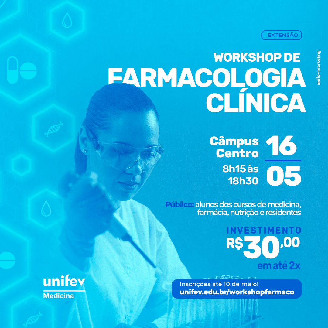 A Unifev realizará, no dia 16 de maio, das 8h15 às 18h30, no Câmpus Centro, o Workshop de Farmacologia Clínica, organizado pelo curso de Medicina. A capacitação é voltada a estudantes de Medicina, Farmácia, Nutrição, além de residentes, médicos e demais profissionais da área da saúde.