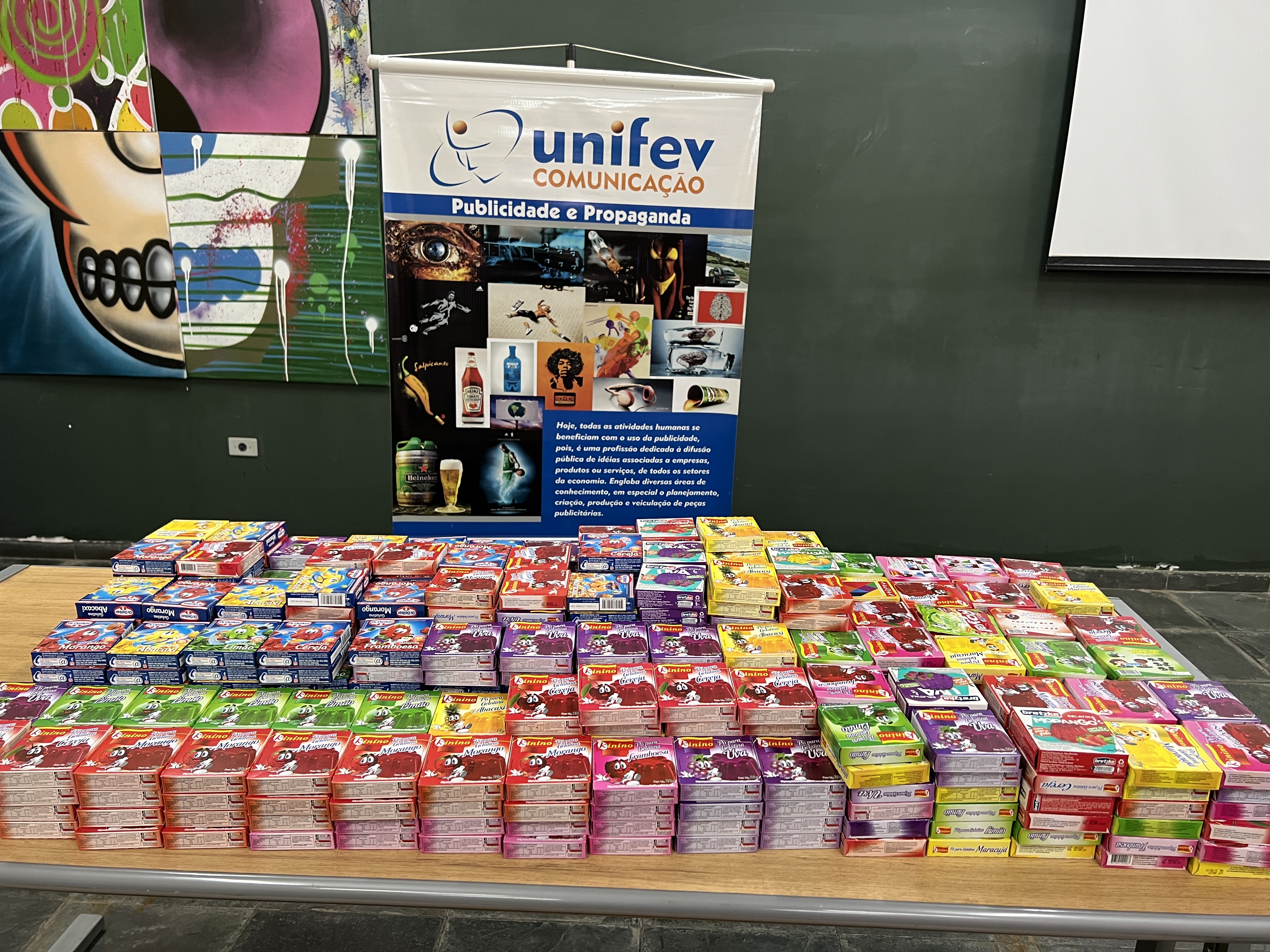 Na manhã desta quarta-feira (dia 05), a graduação em Publicidade e Propaganda da Unifev fez uma doação de gelatinas à Santa Casa de Votuporanga. A entrega foi realizada no Laboratório Integrado de Comunicação (Lab.In) e totalizou 628 caixinhas do produto.