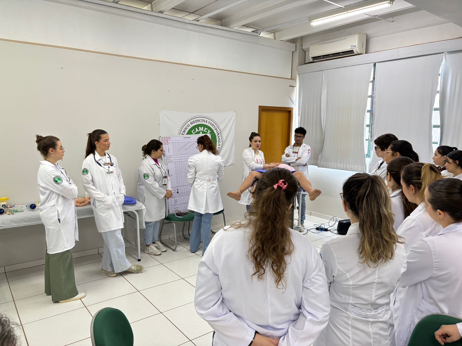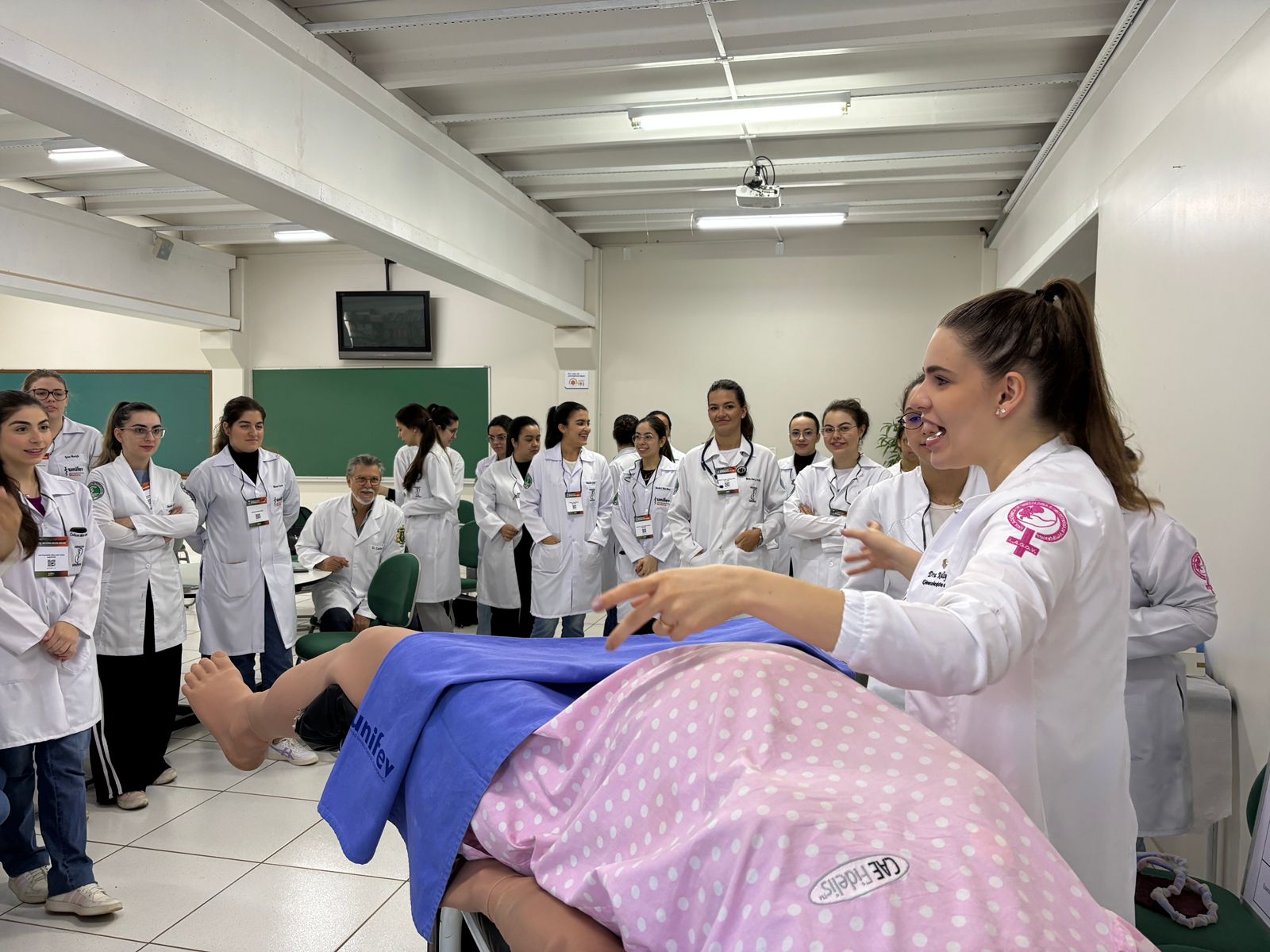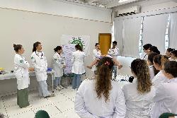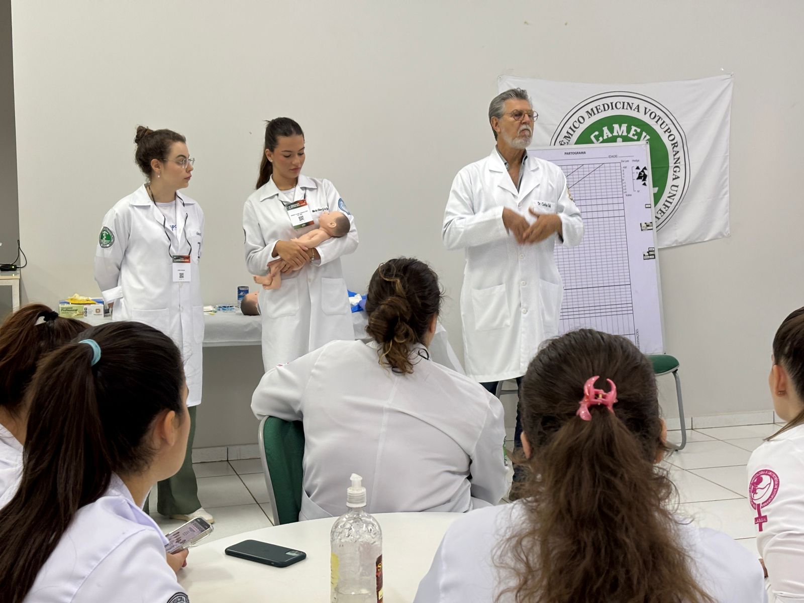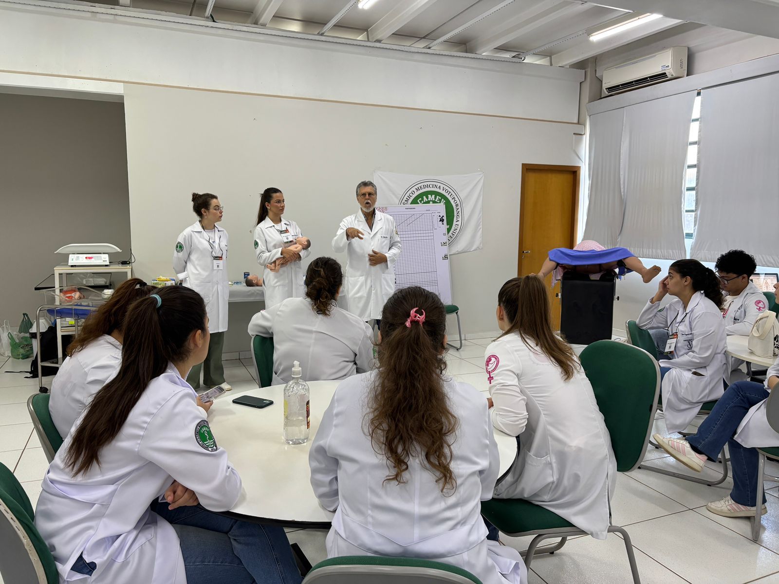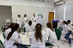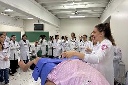 Com o tema “Parto normal e recepção do recém-nascido”, o encontro contou com a participação de médicos especialistas e foi dividido em dois momentos: uma introdução teórica sobre os principais aspectos do parto e dos cuidados neonatais com a professora Kally, e uma atividade prática com manequins de simulação realística, que permitiu aos discentes vivenciar, de forma dinâmica, situações reais da rotina médica, com o pediatra e docente do curso de Medicina, Prof. Esp. Carlos Alberto Tellis.