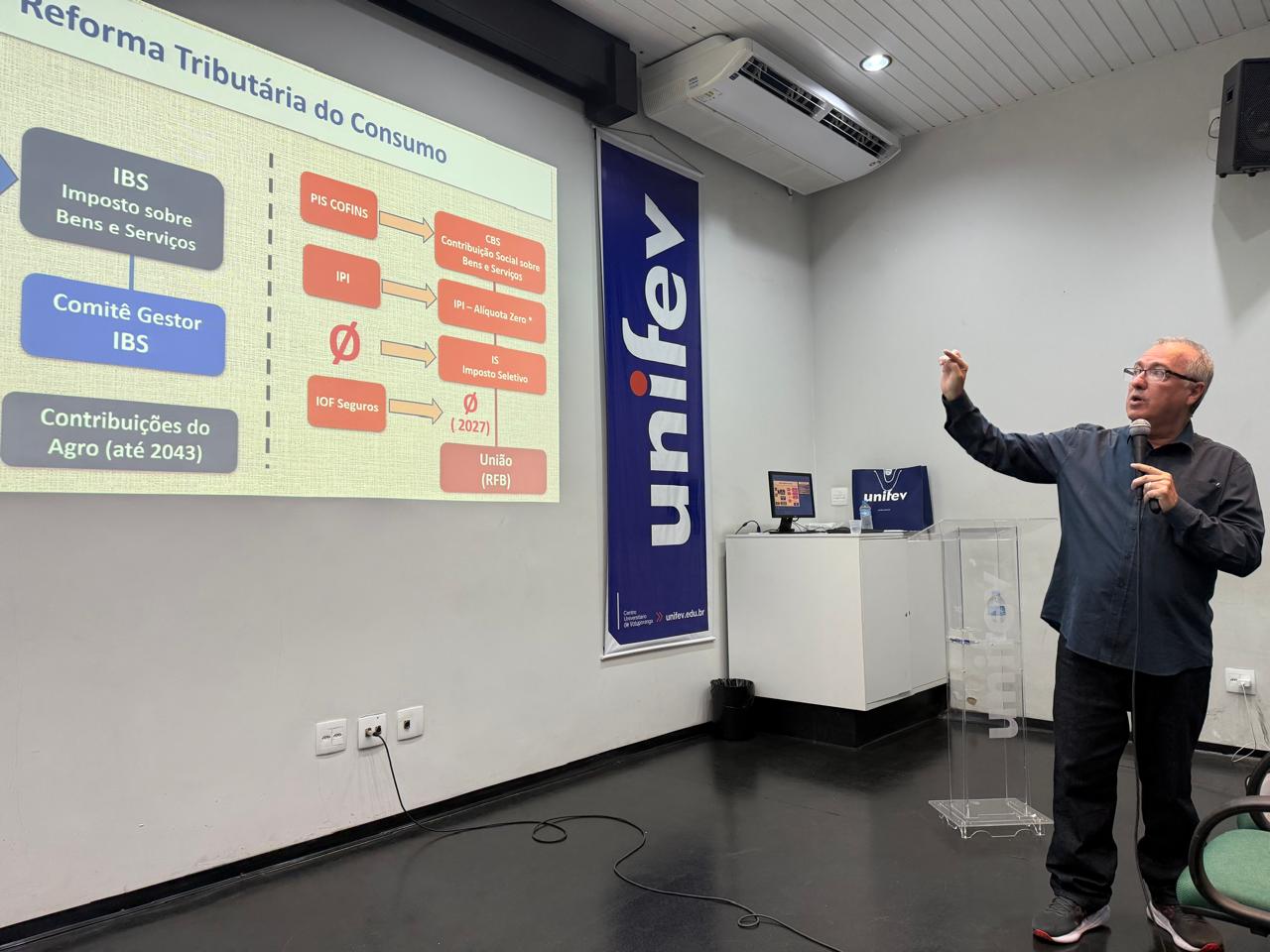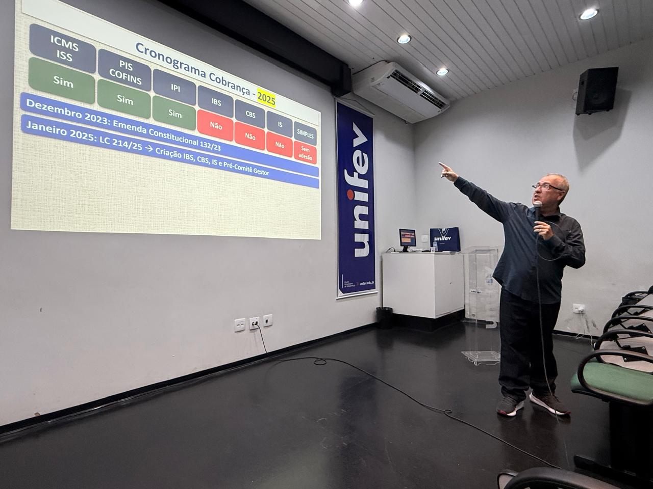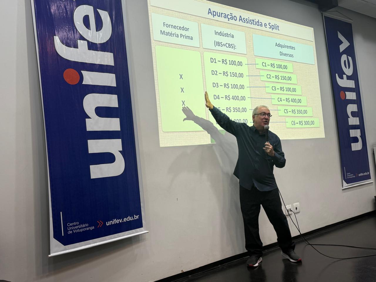 Os cursos de Administração e Ciências Contábeis da Unifev realizaram na noite da última quarta-feira (22/10), no auditório do câmpus Centro, a palestra "Reforma Tributária", em parceria com a Associação dos Contabilistas da Região de Votuporanga. O evento, gratuito e aberto à comunidade, recebeu o Prof. Me. Sérgio Augusto Nogueira, auditor fiscal da Secretaria da Fazenda do Estado de São Paulo desde 2006, para relatar a revisão do sistema de impostos e suas implicações.