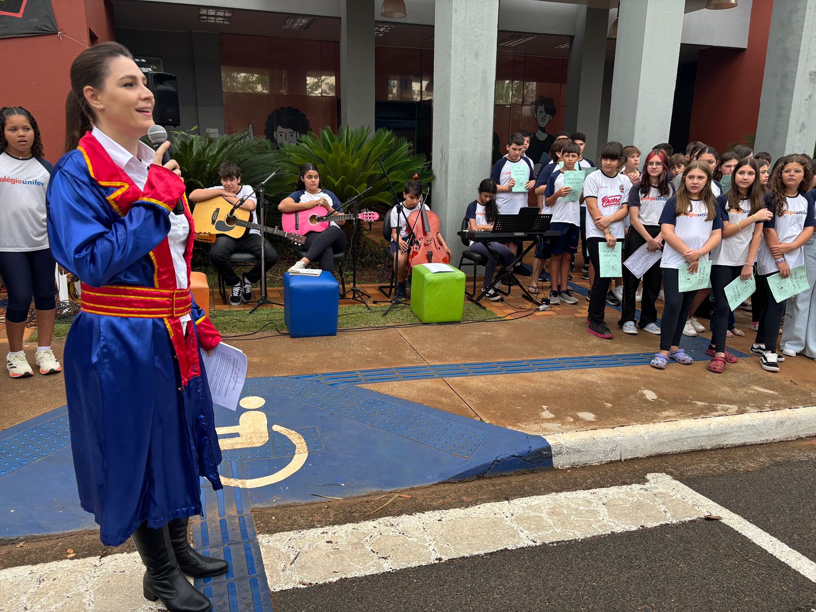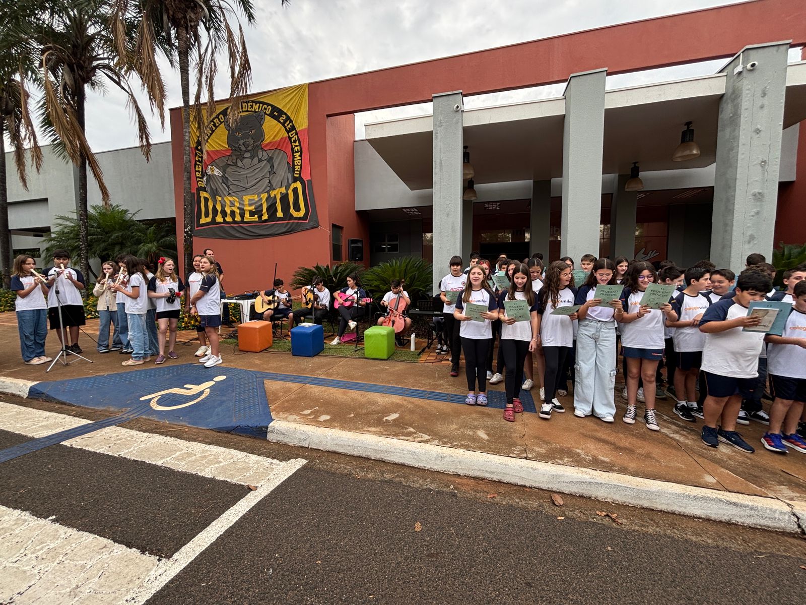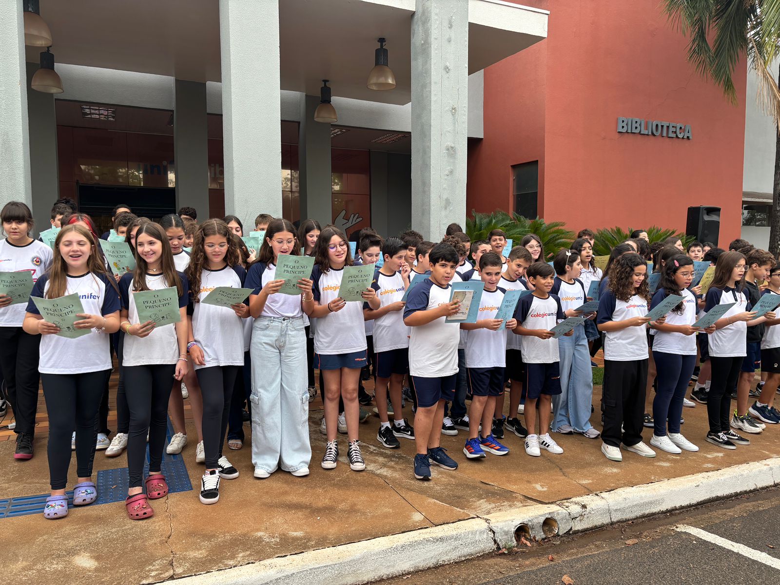 Os alunos dos 6os anos do Colégio Unifev realizaram, na manhã desta quinta-feira (30), o encerramento do projeto interdisciplinar LiterArte 2025, que envolveu as disciplinas de Língua Portuguesa, Música e Artes, em parceria com a Biblioteca da Unifev.