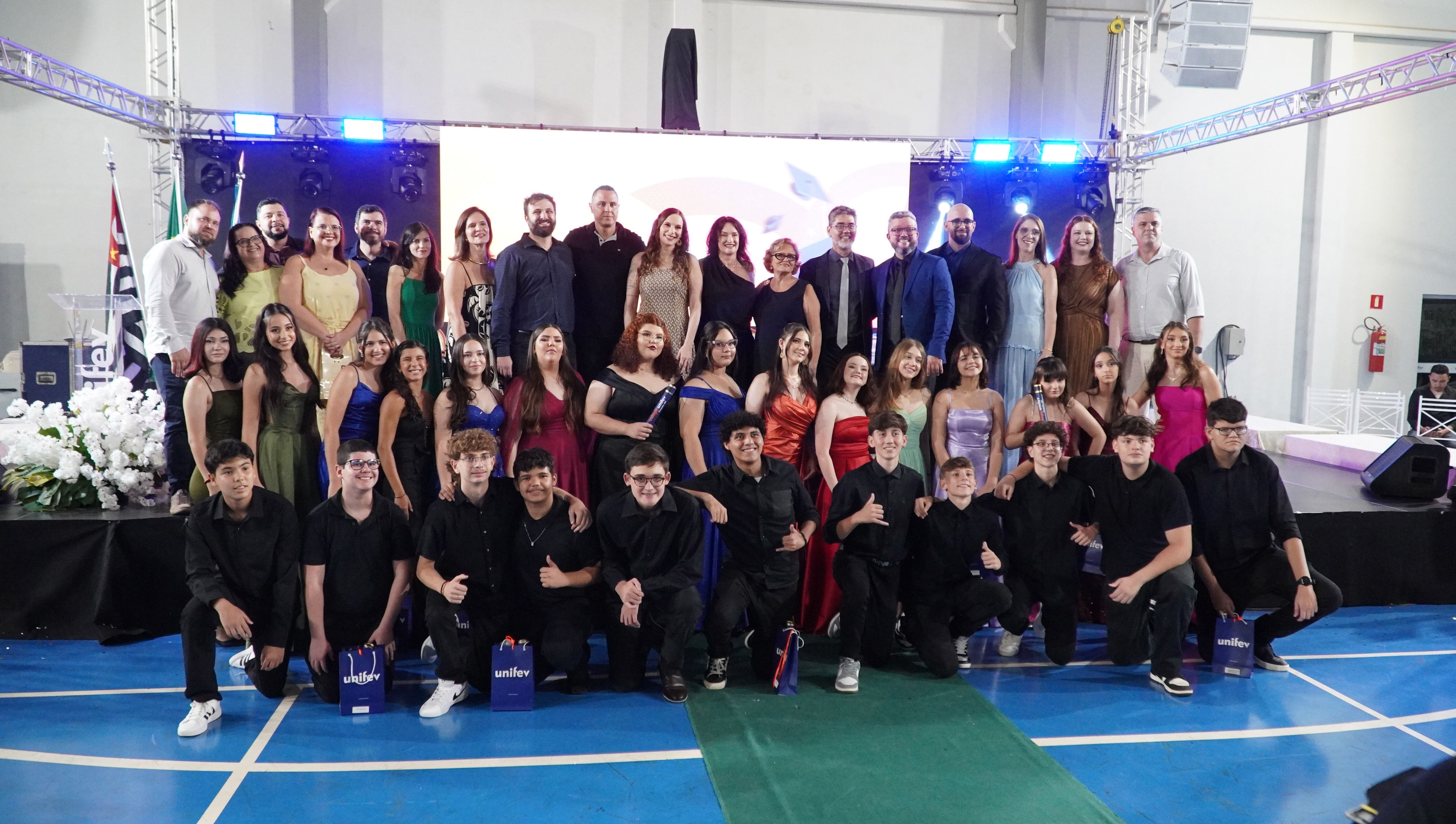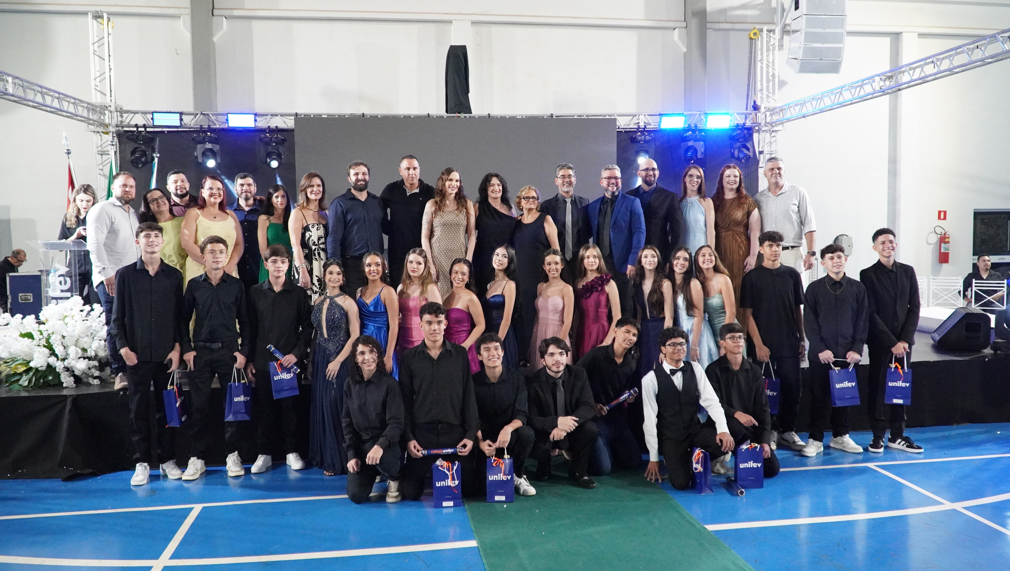 O Colégio Unifev realizou na noite da última sexta-feira (12/12) a cerimônia de entrega dos Certificados de Conclusão aos alunos dos 9º Anos, turmas A, B e C. Realizada no Complexo Poliesportivo da Cidade Universitária, a solenidade reuniu pais, familiares, direção, professores e colaboradores, para celebrar o fechamento bem-sucedido do ciclo do Ensino Fundamental e o início de uma nova fase para os formandos.