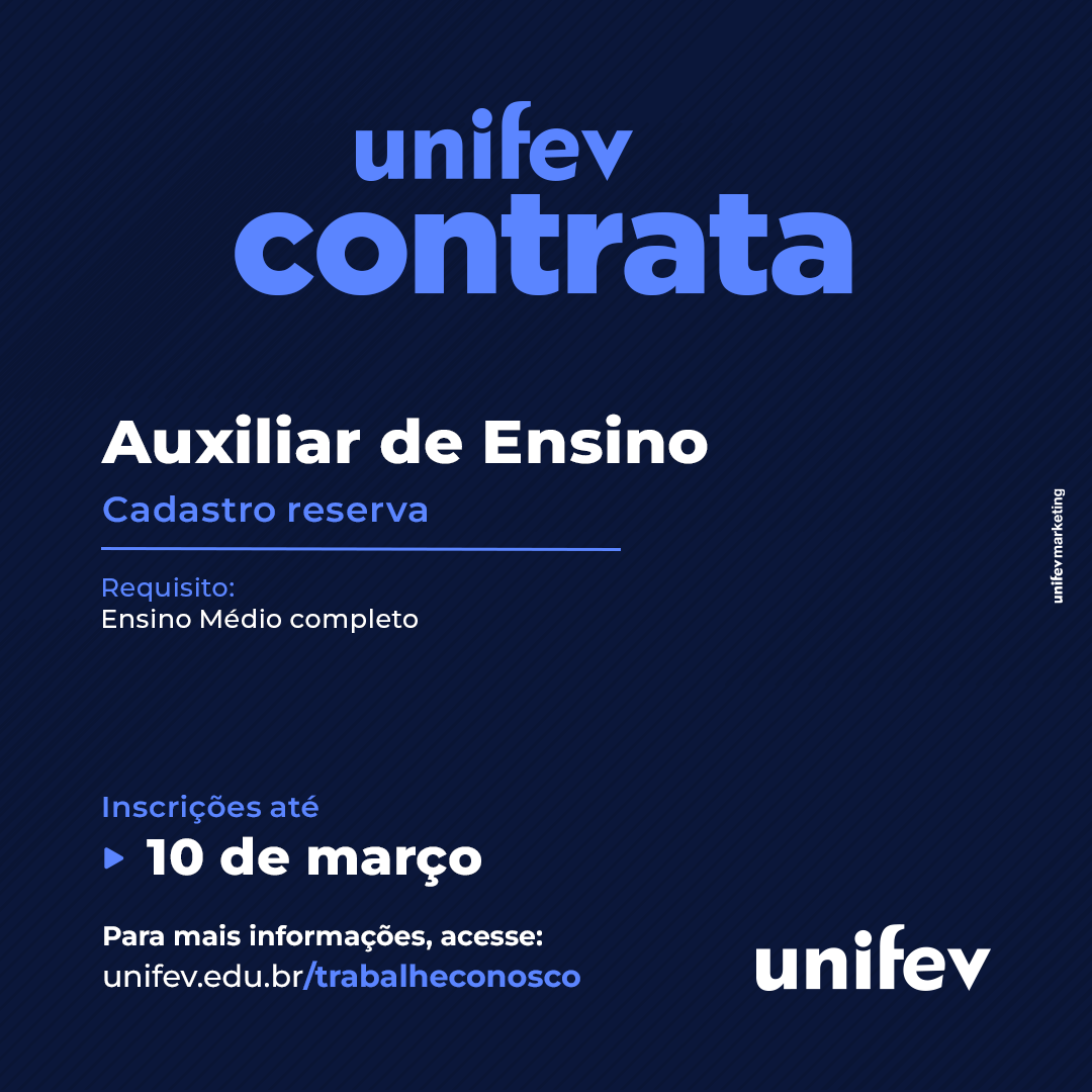 A Unifev abriu edital para seleção e eventual contratação para o cargo de auxiliar de ensino (cadastro reserva). As inscrições podem ser realizadas até o dia 10 de março, mediante o preenchimento da ficha eletrônica disponível no site da Instituição.