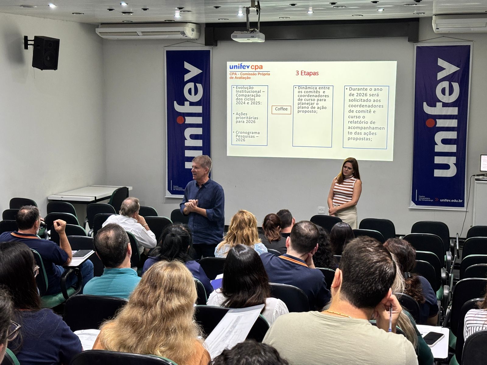 A Unifev realizou o XVII Fórum de Autoavaliação Institucional nesta terça-feira (24) no auditório do câmpus Centro, reunindo integrantes de todos os comitês, para discutir sobre o universo educacional e acadêmico. Na oportunidade, estiveram presentes o reitor, Prof. Dr. Osvaldo Gastaldon; o pró-reitor acadêmico, Prof. Me. Walter Francisco Sampaio Filho; a coordenadora da Comissão Própria de Avaliação (CPA), Profa. Ma. Patricia Salles Maturana; coordenadores de cursos, docentes, supervisores e colaboradores.