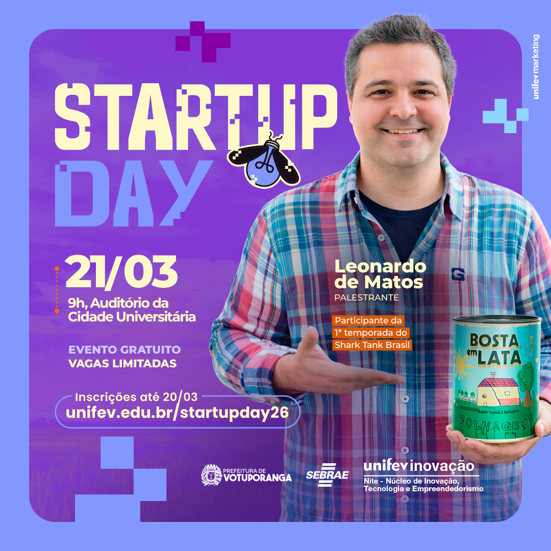 A Unifev está com inscrições abertas para a 12ª edição do Startup Day, que será realizada no dia 21 de março, das 9h às 12h, no auditório da Cidade Universitária. Em Votuporanga, o evento voltado ao empreendedorismo é promovido pelo Núcleo de Inovação, Tecnologia e Empreendedorismo (Nite) da Instituição, em parceria com o Serviço Brasileiro de Apoio às Micro e Pequenas Empresas (Sebrae).