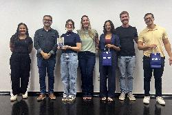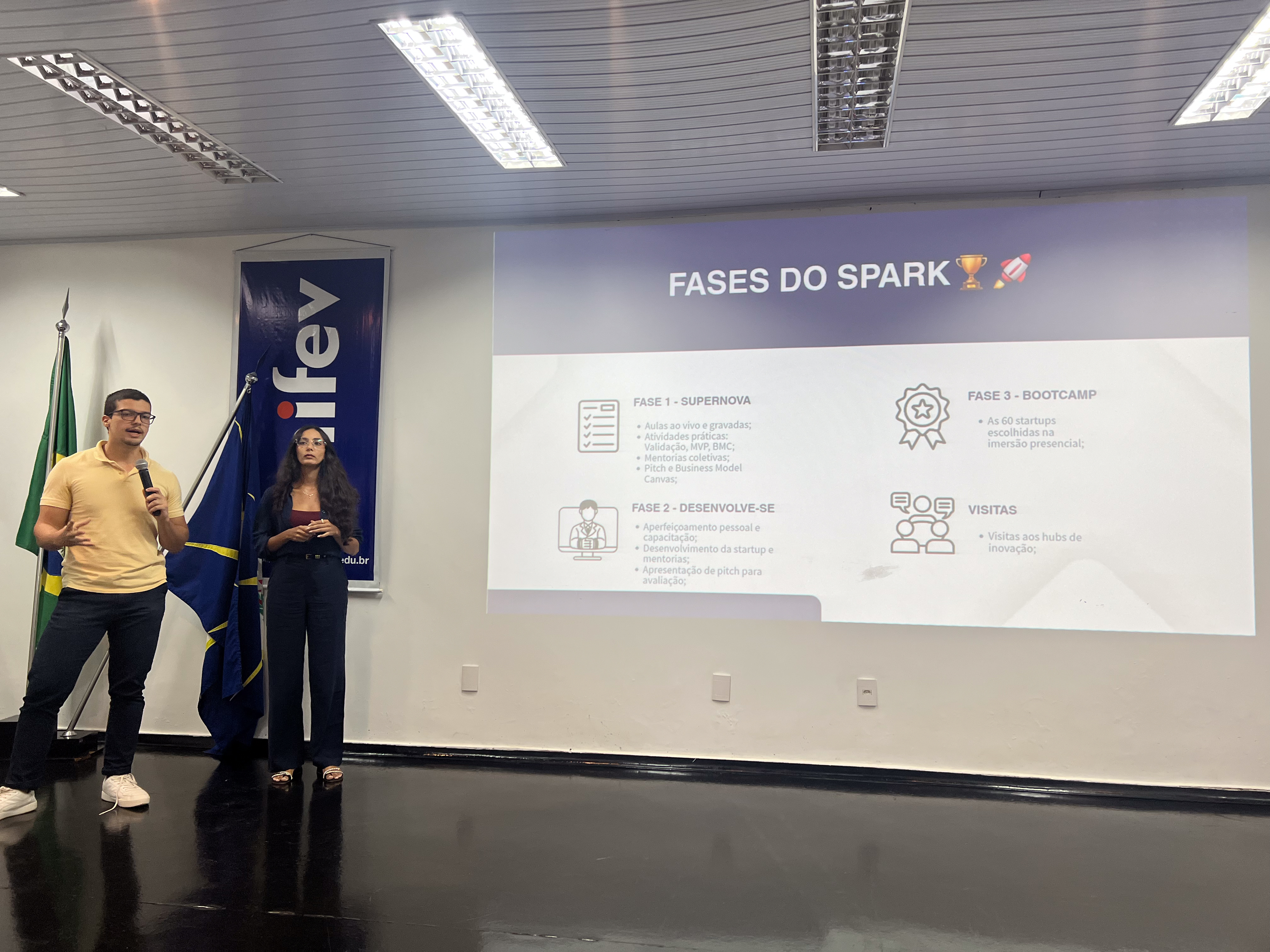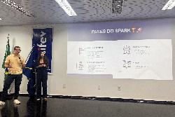 A aluna Amanda Lazarini, do curso de Administração, e o aluno Daniel Cardoso, do curso de Engenharia da Computação, apresentaram seus projetos de startups desenvolvidos no Nite, que se destacaram entre os dez mil inscritos no Bootcamp do Programa Spark.