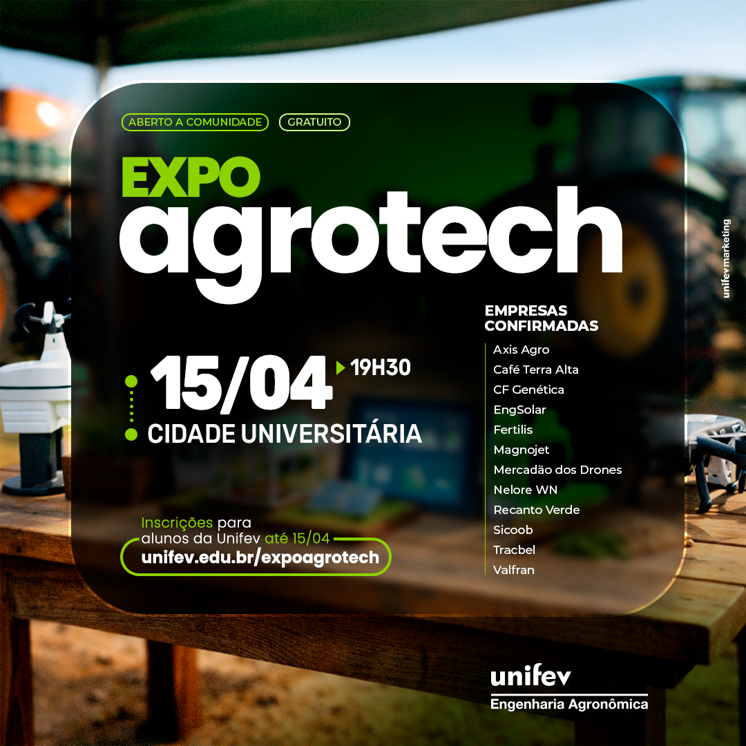 A Unifev realizará, no próximo dia 15 de abril, a partir das 19h30, a Expo AgroTech 2026. Destinado a estudantes universitários e aberto ao público em geral, o evento é promovido pelo curso de Engenharia Agronômica e tem como objetivo apresentar as principais tendências em inovação, tecnologia e empreendedorismo no campo. A programação contará com a exposição de empresas convidadas dos setores agrícola e do agronegócio.